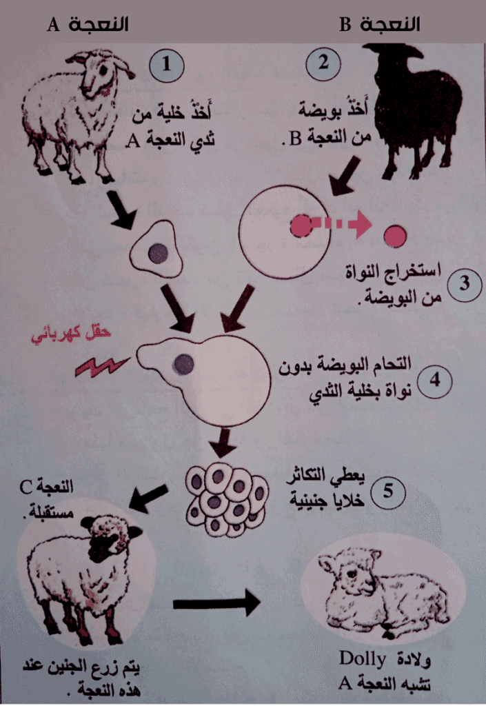 مثال النعجة DOLLY: أول حيوان مستنسخ بهذه الطريقة.