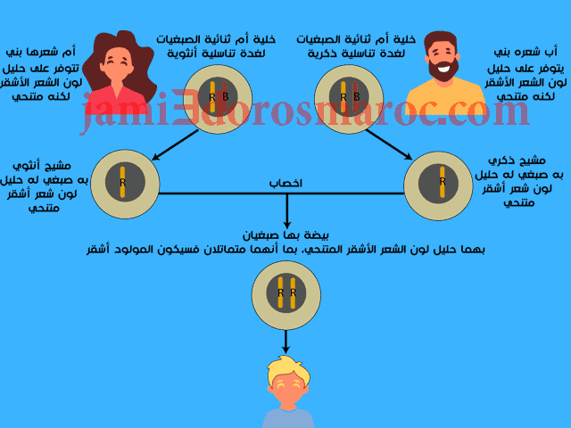 احتمالات لون الشعر بعد الإخصاب بين حليل B و R عند الأب والأم: