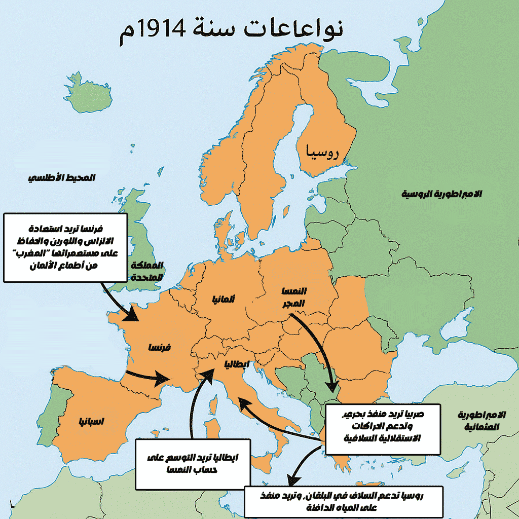خريطة النزاعات و التحالفات الأوروبية سنة 1914م