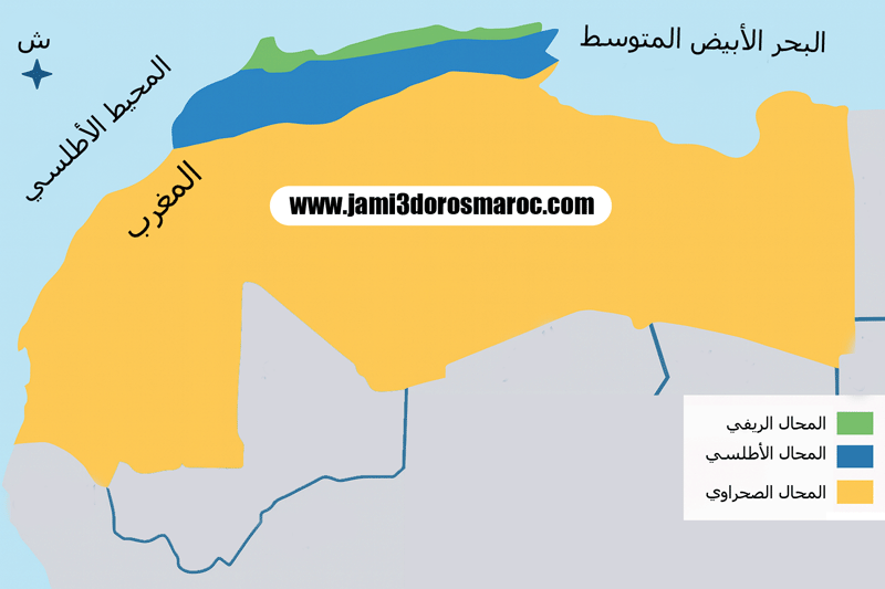 - المجال الصحراوي: يوجد في الجنوب، ويتكون من طبقات رسوبية (كلس، صلصال) من الزمن الثاني، وطبقات ملتوية (كوارتزيت، شست) من الزمن الثالث. ويشمل معظم مساحة المغرب، الجزائر، تونس، جل الأراضي الليبية والموريتانية.