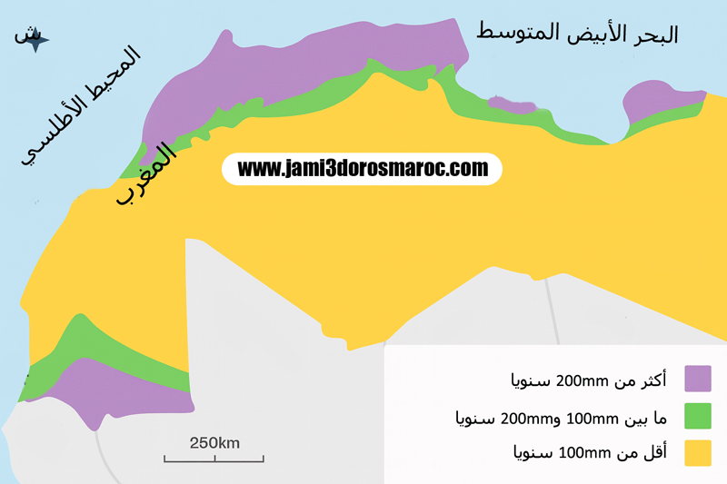 - المناطق الأطلسية (المغرب، الجزائر، تونس، شمال ليبيا، وسط موريتانيا): بين 100 و200 ملم سنويًا.