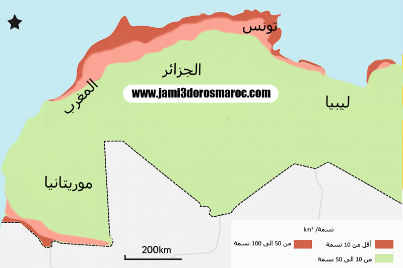 - المناطق الريفية (المغرب، الجزائر، تونس، شمال ليبيا، جنوب موريتانيا): أكثر من 200 ملم سنويًا.