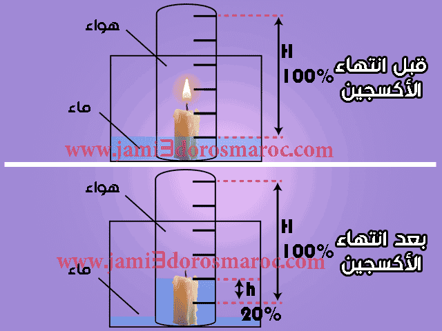 يدل انطفاء الشمعة و تصاعد مستوى الماء على اختفاء غاز ثنائي الأكسجين الضروري لاشتعال النار أما الغاز المتبقي لا يساعد على ذلك ، انه غاز ثنائي الازوت ، و بما أن نسبة h/H هي %20 فهذا يعني أن الأكسجين يشكل خمس حجم الهواء 1/5.