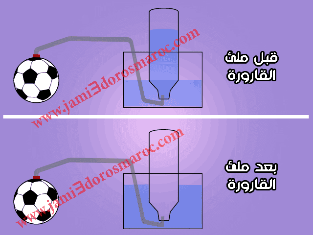 نضع القارورة بشكل مقلوب في الاناء و نركب بالأنبوب المطاطي ابرة النفخ و نغرزها في فوهة الكرة و نضع طرفه الاخر أسفل فوهة القارورة، فنضغط على الكرة لنسحب منها 1.5L من الهواء ليملأ القارورة عبر الأنبوب المطاطي، و بعد انتهاء الملأ نضع الكرة فوق الميزان لنحسب كتلتها ، فنجد أنها أصبحت تزن 285g نرمز لها بm2.