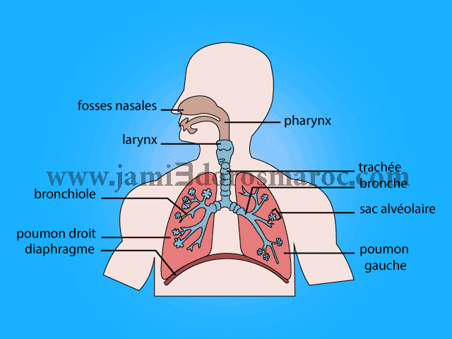 L’air inspiré passe par les fosses nasales (nez) et la bouche, puis traverse le pharynx, le larynx, la trachée, les bronches et les bronchioles jusqu’aux sacs alvéolaires.