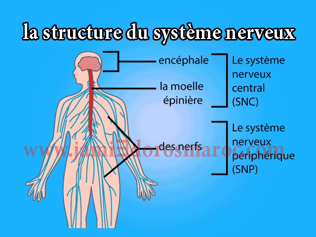 Le système nerveux se divise en deux parties : le système nerveux central (SNC) est constitué de l’encéphale et de la moelle épinière, el le système nerveux périphérique (SNP) qui’est constitué des nerfs.