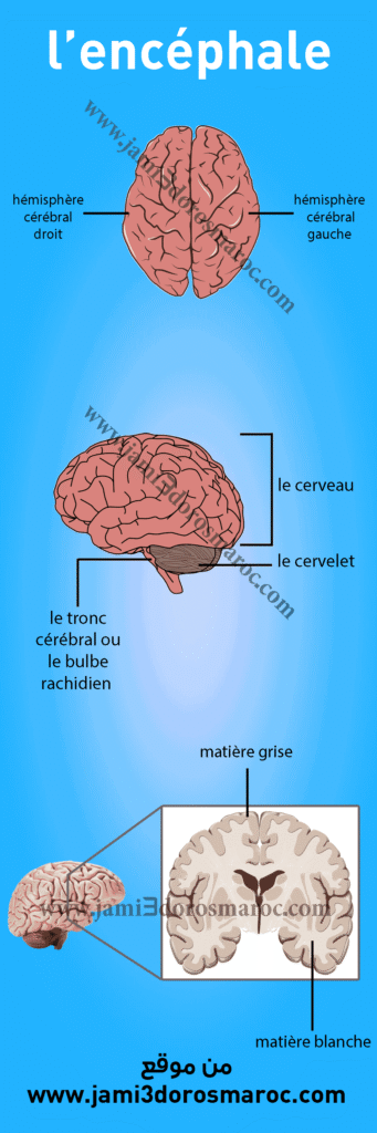 L’encéphale est constitué de trois parties principales : le cerveau, le cervelet et le tronc cérébral, également connu sous le nom de bulbe rachidien.