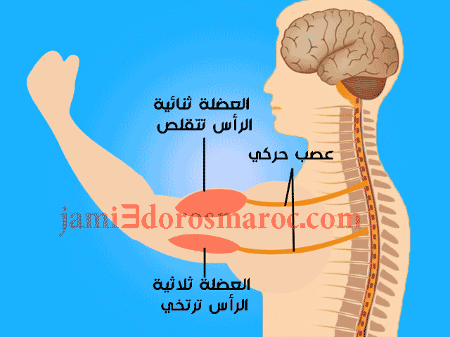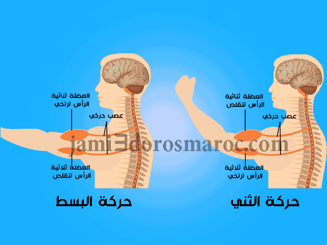 أثناء حركة الثني: تتصلب العضلة ذات الرأسين و تضيق: في هذه الحالة نقول أنها تتقلص ،في حين ، ترتخي العضلة ثلاثية الرؤوس.