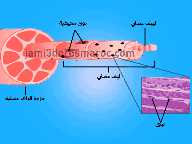 - كل ليف عضلي يتميز بتوفره على عدة نوى محيطية و أشرطة قابلة للتقلص تسمى لييفات عضلية توجد بالسيتوبلازم الخاص به.