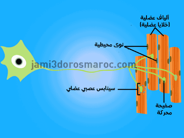 على مستوى العضلات ، تشكل الألياف العصبية التحركية (العصبونات) تشجرات تنتهي بمناطق تسمى السينابس ، وتضمن هذه السينابسات الاشتباك (الاشتباك العصبي العضلي) بين نهايات الألياف العصبية التحركية والألياف العضلية (الخلايا العضلية).