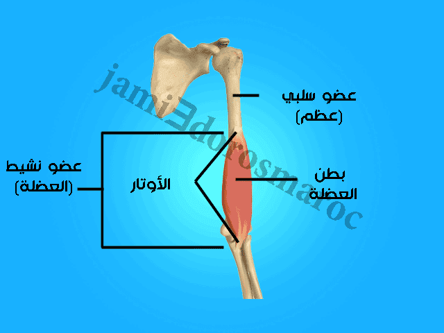 - العضلات هي الأعضاء النشيطة بالحركة ، تتكون من جزء مركزي (البطن) والأوتار التي تربطها بالعظام.