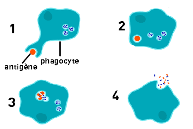 La phagocytose effectuée par des phagocytes comme les polynucléaires et les macrophages, comprend quatre étapes clés :