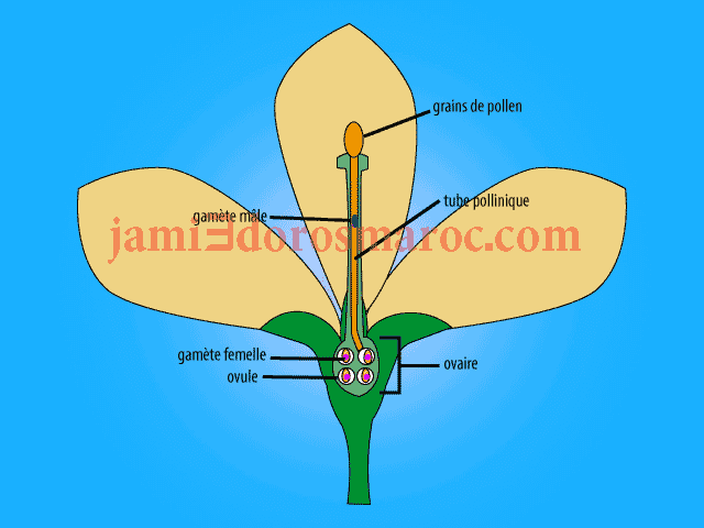À l’intérieur de l’ovule, il y a la rencontre et la fusion des deux gamètes mâle et femelle pour former un œuf fécondé. Ce processus est appelé la fécondation chez les plantes à fleurs.