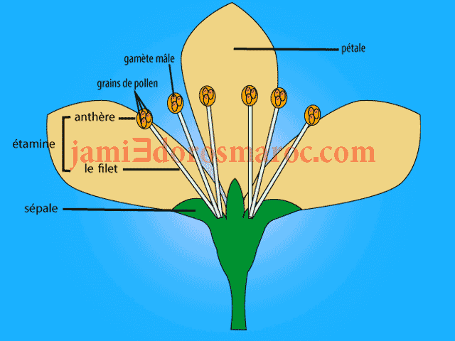- Organes reproducteurs mâles : les étamines ou l’androcée, comprenant l’anthère et le filet.