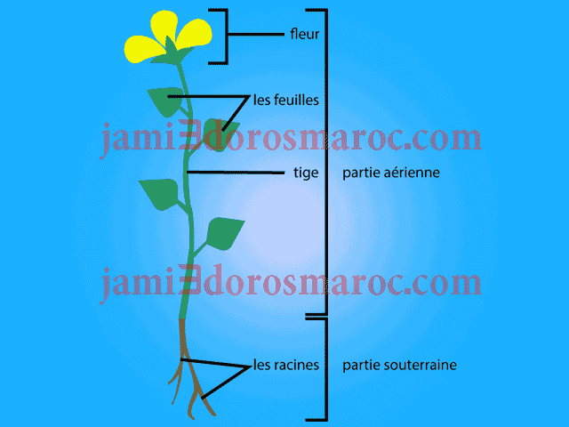 Une plante à fleurs est composée d’une partie souterraine, les racines, et d’une partie aérienne, comprenant les tiges, les feuilles et les fleurs.