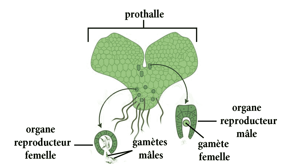 Chaque prothalle comporte des organes mâles qui produisent des gamètes mâles, ainsi que des organes femelles qui produisent les gamètes femelles.