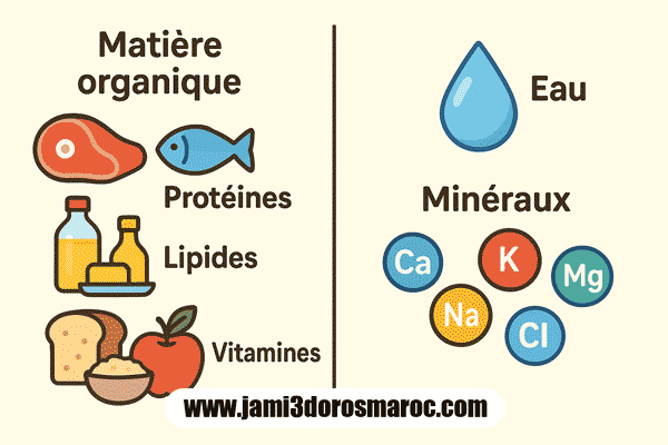 • Matière minérale : eau et sels minéraux (sodium, potassium, magnésium, calcium, chlore).