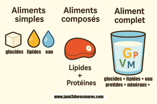 • Composés : combinaison de plusieurs aliments simples (ex. viande = protides + lipides).