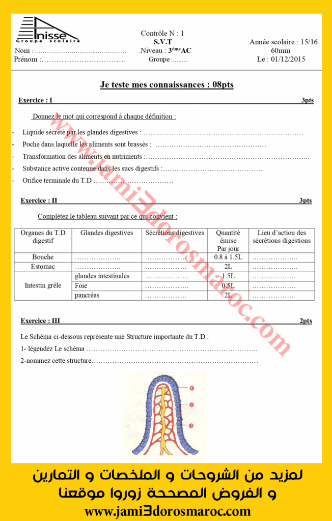 مرحباً بكم أعزائي التلاميذ في موقع jami3dorosmaroc. نقدم لكم اليوم النموذج الثالث للفرض الأول في مادة علوم الحياة والأرض للسنة الثالثة إعدادي، الدورة الأولى، المسلك الدولي، خيار فرنسي “devoir 1 svt 3ac semestre 1”. يمكنكم تحميل المستند بصيغة PDF من خلال الضغط على زر التحميل الموجود أسفل الصفحة.